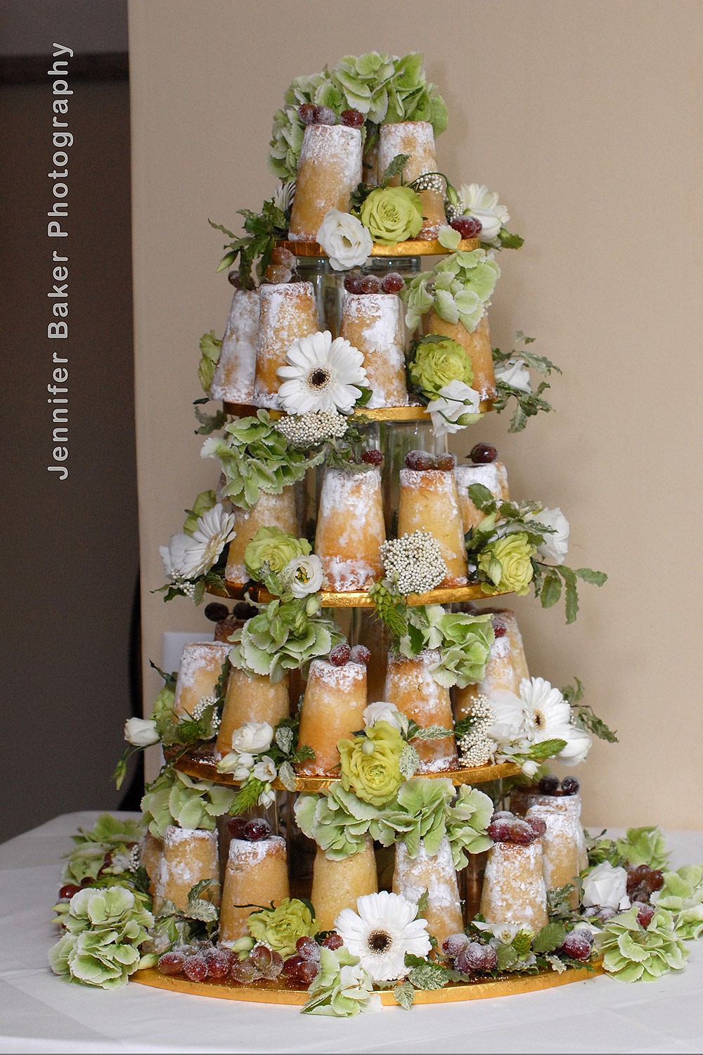 Vanilla Sponges filled with Raspberry Jam and Vanilla buttercream form a tower of sandcastles, dusted with icing sugar and served with sugared grapes and fresh flowers.